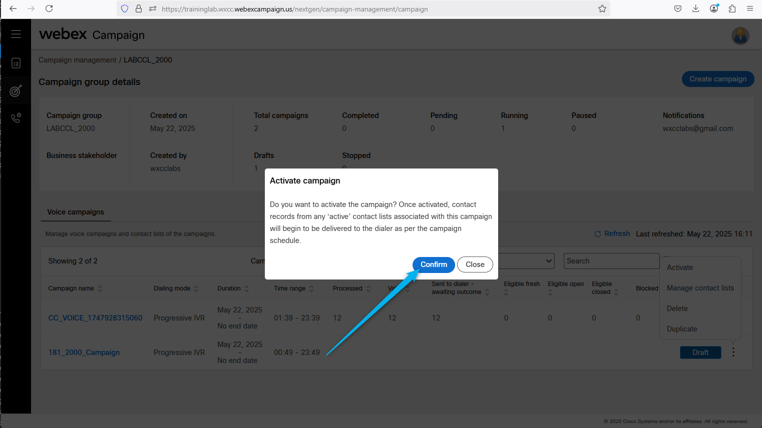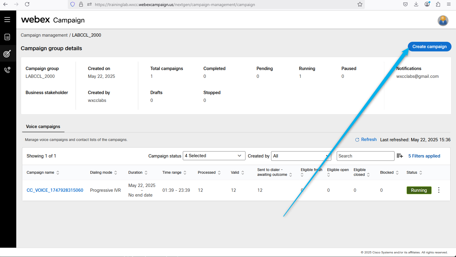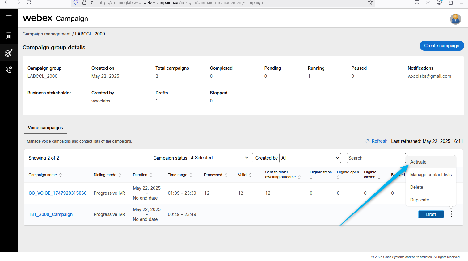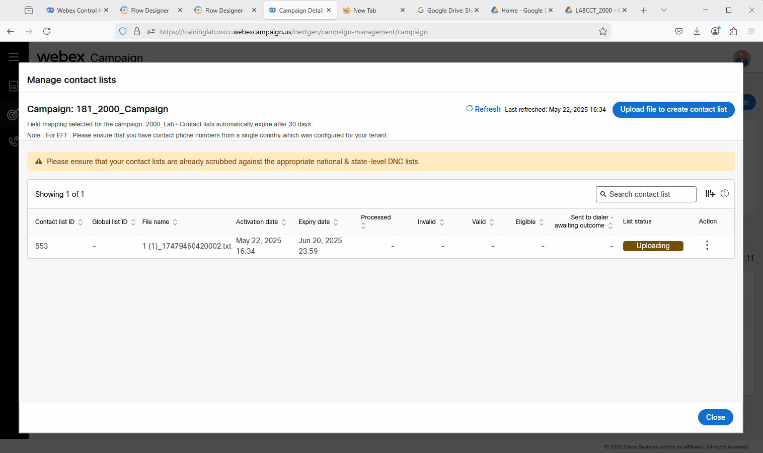 Go back to Webex Campaign Manger, find your campaign and click on Manage contact lists.