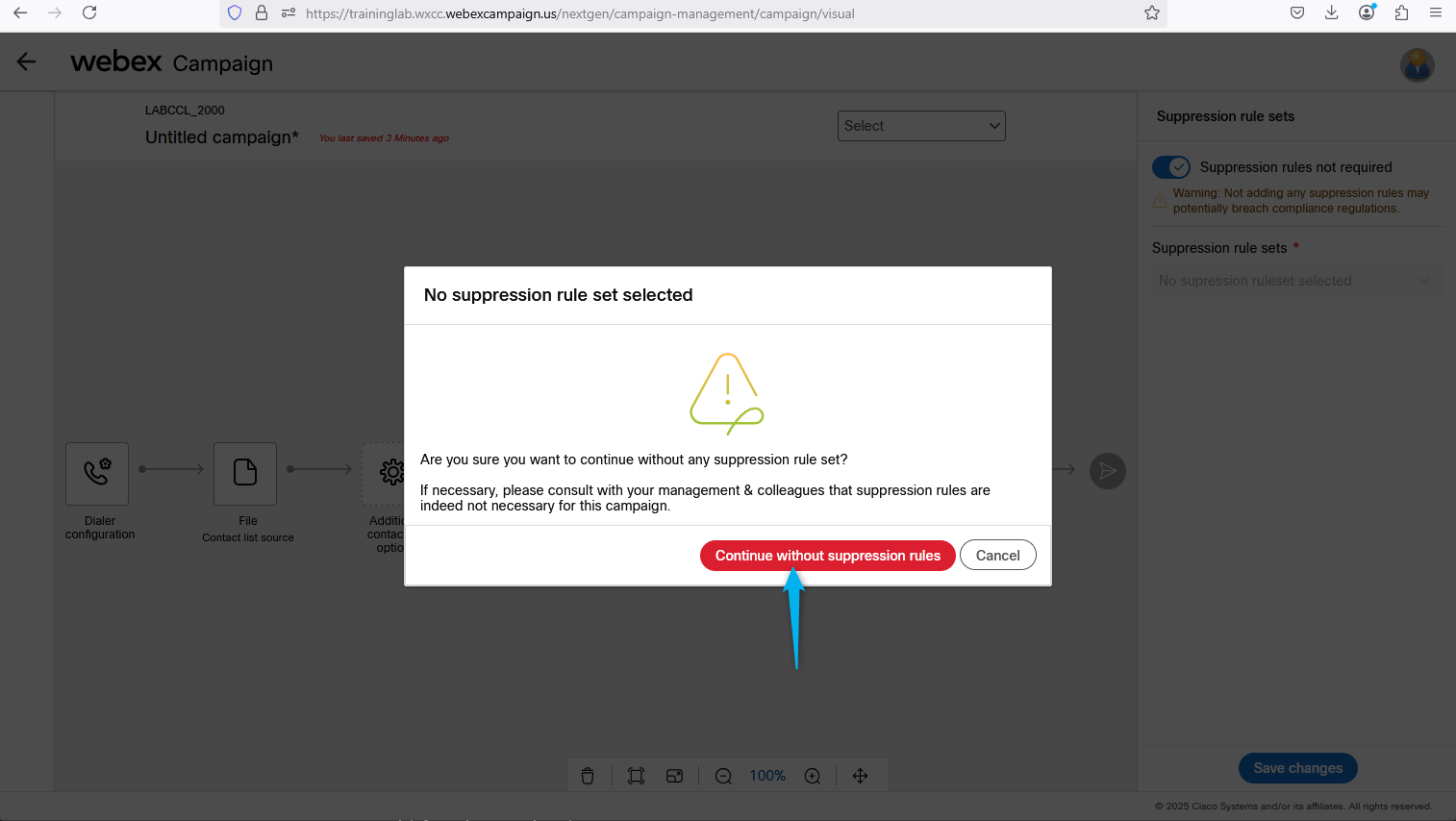 Confirm that you would like to Continue without supression rules.