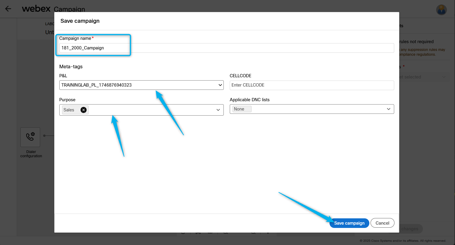 . For P&L from the list select TrainingAB_PL_17748776940323. For Purpose select from the list Sales, and click on Save campaign._2000_Campaign