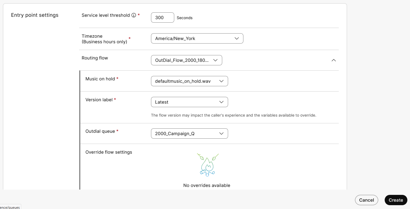 Configure Service Level Threshold with 300 seconds, select the flow that you have created in the previous Task, add a music on hold and select the Outdial Queue with name