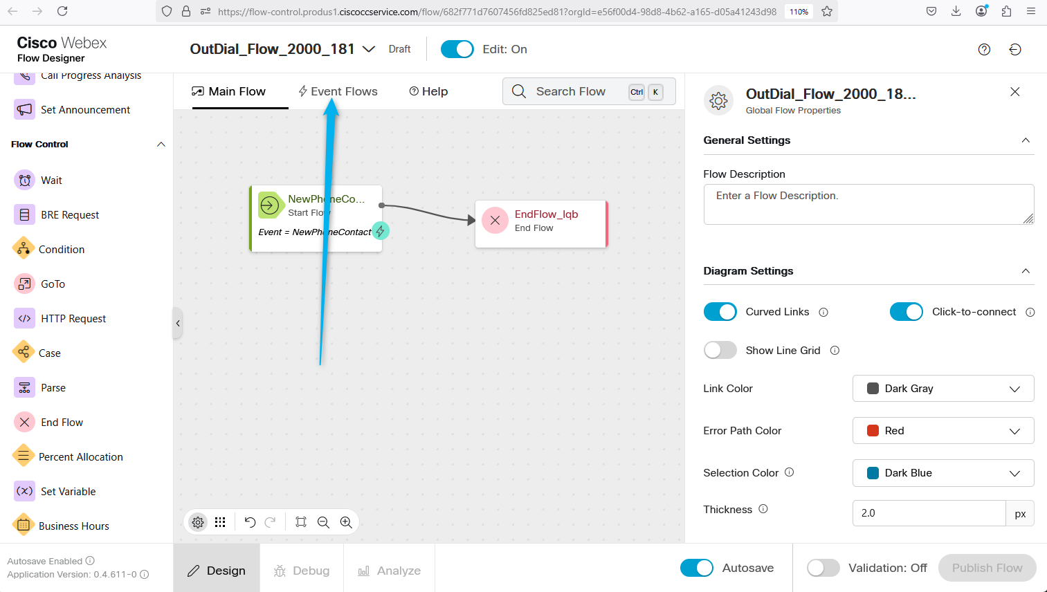 In the Main Flow, add End Flow block and connect New Phone Contact block to the End Flow block.