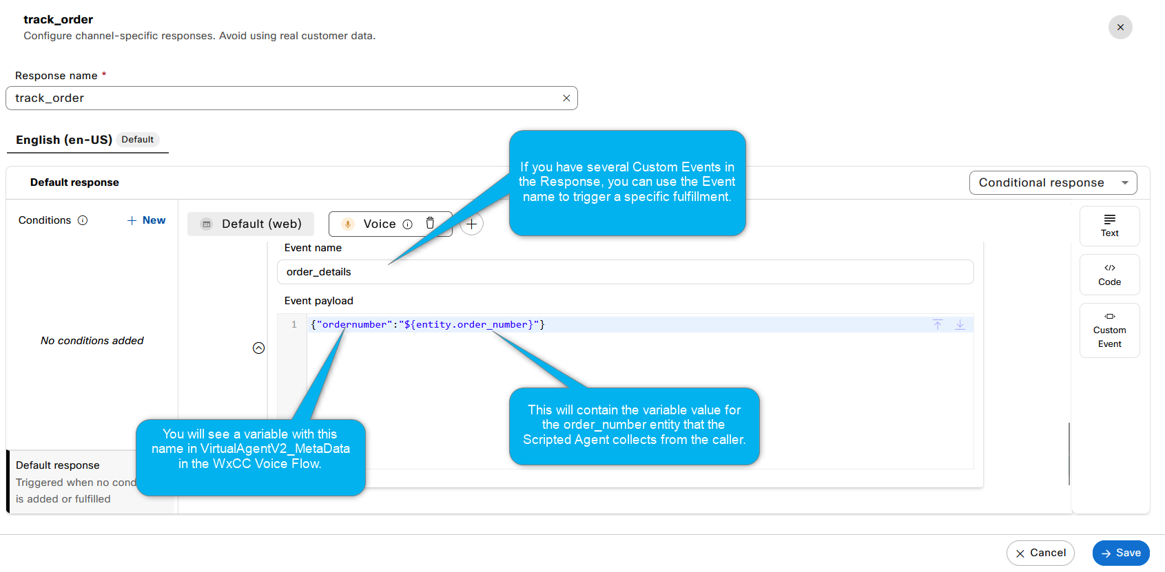 Understanding why we need to use a Custom Event for fulfillment: The API call to retrieve the order status can be made from the Voice Flow. By using a Custom Event, we send the order_number entity that the Scripted Agent collects during the call to retrieve the status.