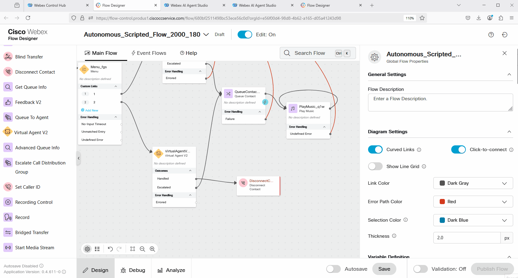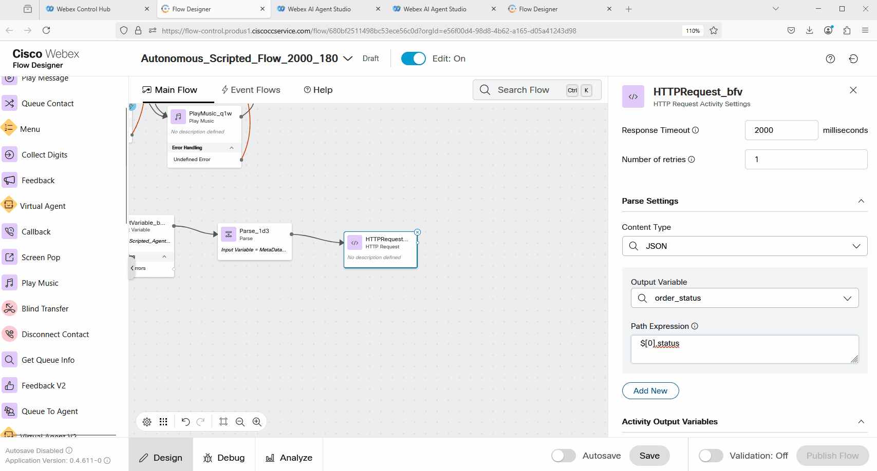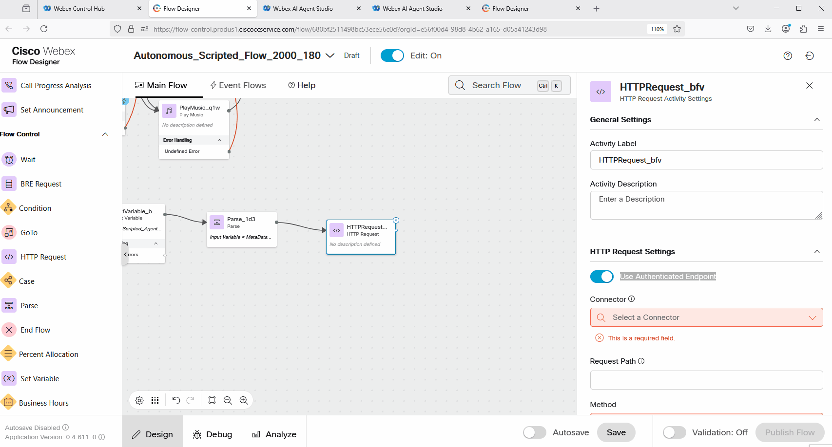 Add Disconnect Contact and connect HTTPRequest node to the Disconnect Contact node. Validate and Publish the flow.