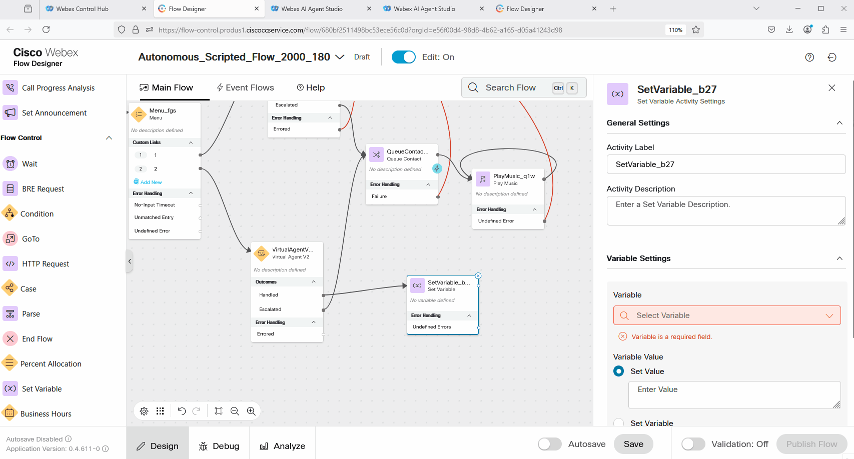 Click on the VirtualAgentV2 block, scroll down to Activity Output Variables, and copy the MetaData variable name. Then, open the SetVariable block and configure the MetaData_Scripted_Agent variable with the variable value you copied from the VirtualAgentV2 block. Make sure to enclose it in curly brackets.