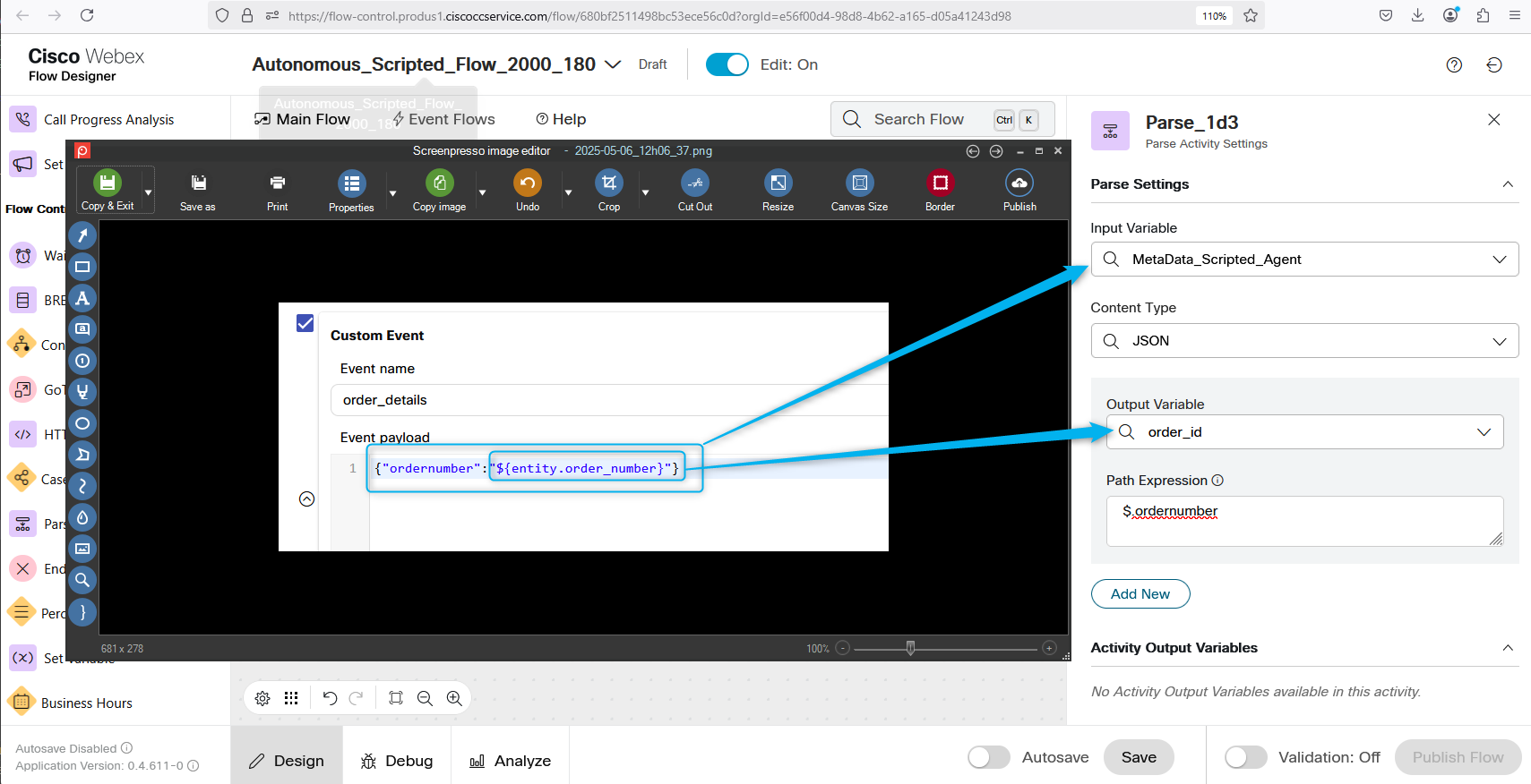 Understanding the Parse node configuration: The goal of the Parse node is to extract the order_number entity received from AI Studio and assign it to the flow variable named order_id. This variable will be used later in the API call.