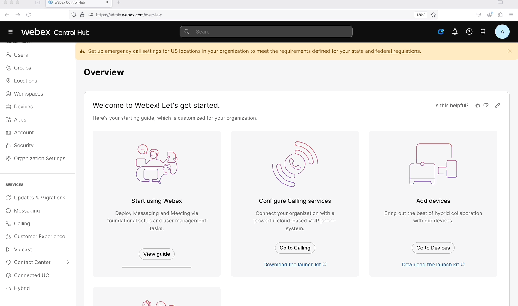 Log in to the Control Hub using the contact center admin credentials.
