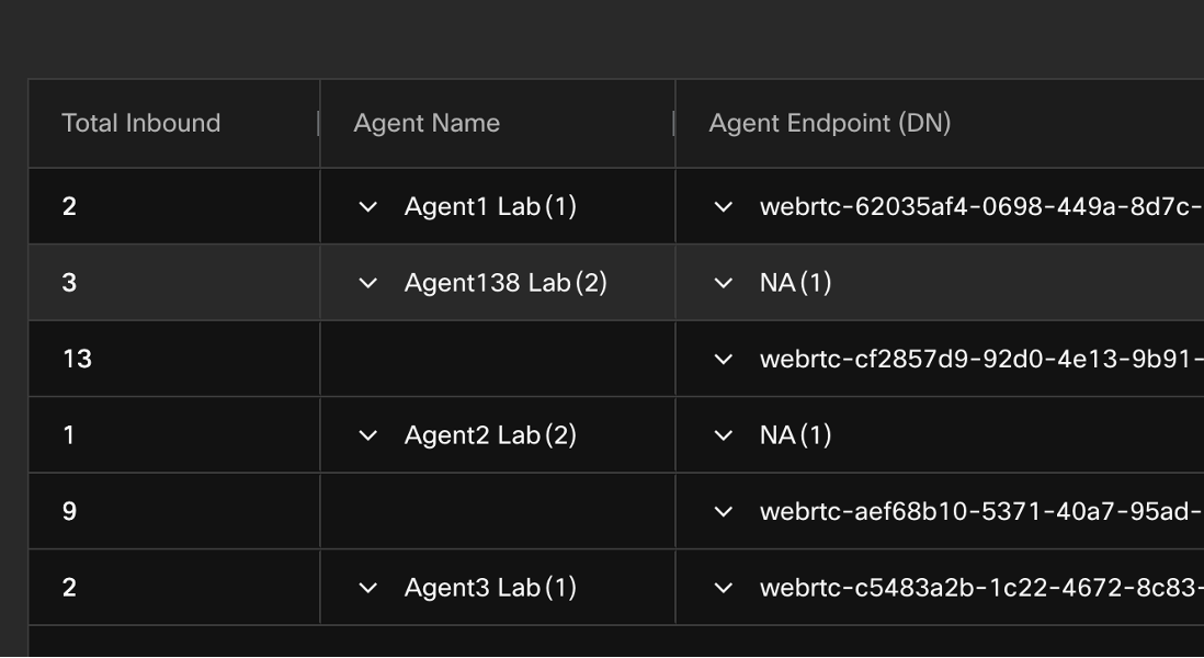 Agent Endpoint (DN)filter and make a note of device types used by the users (Agent and Supervisors). You would notice a mix of Dial numbers and WebRTC devices. -