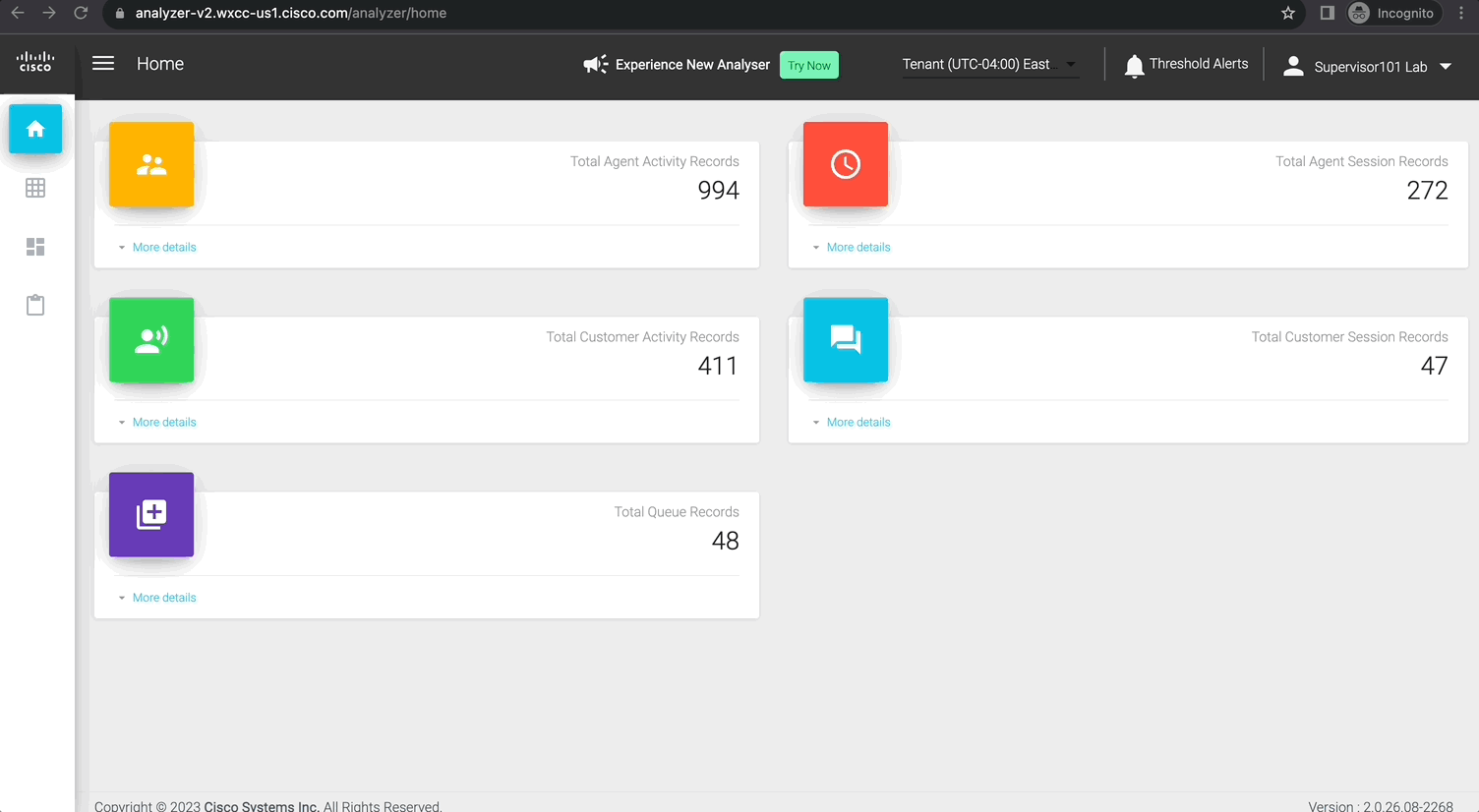 The New Webex Contact Center Analyzer (Analyzer UX Refresh) offers an enhanced and intuitive user interface that enables you to manage stock historical dashboards. It provides faster, more efficient, and focused views of historical analytics for Webex Contact Center, enhancing the integrated experience. The stock historical dashboards offer ready-to-use metrics, allowing you to generate metrics related to entry points, queues, teams, contacts, and agents for strategic decision-making.