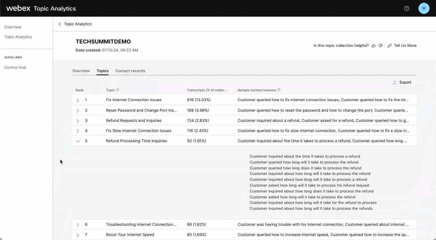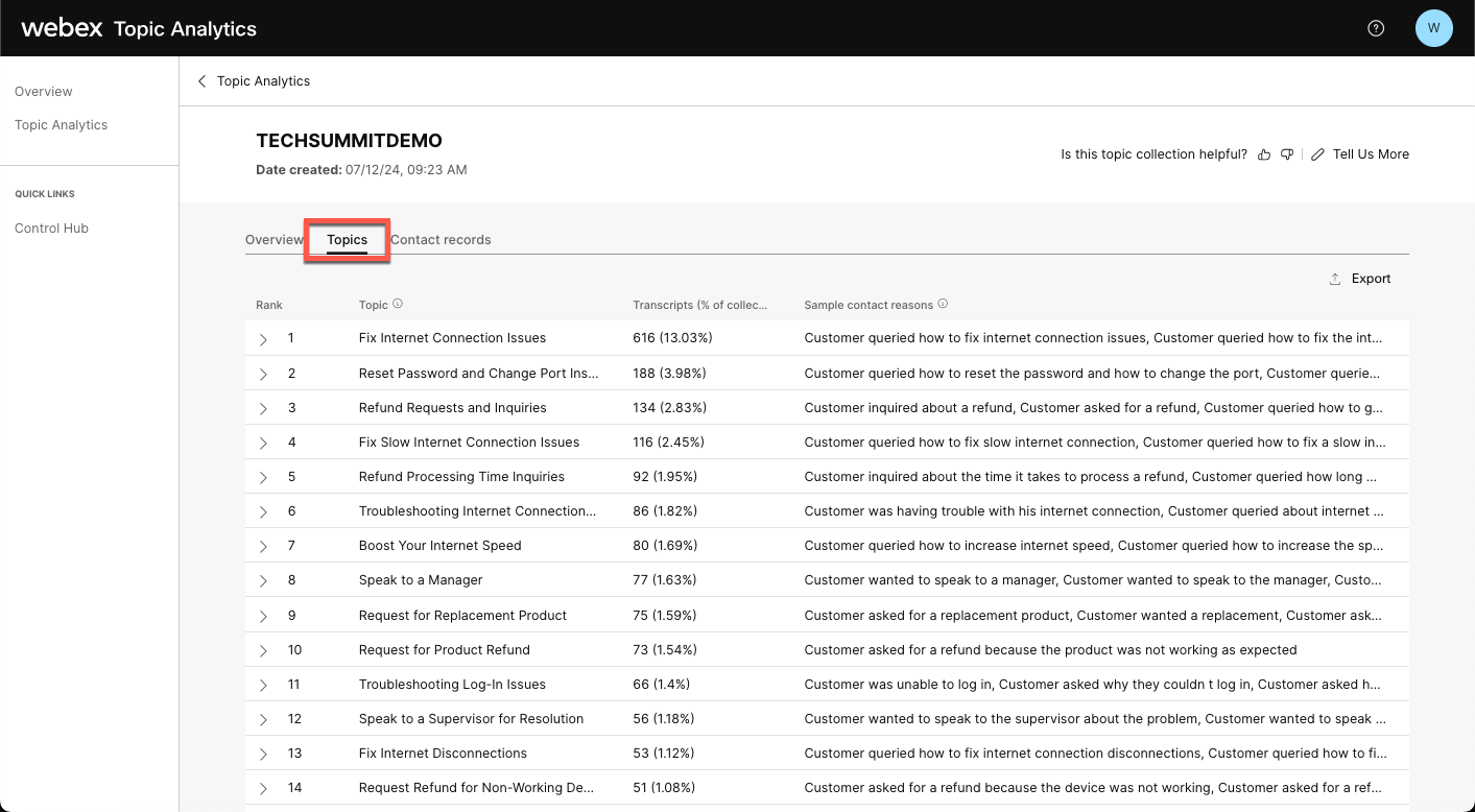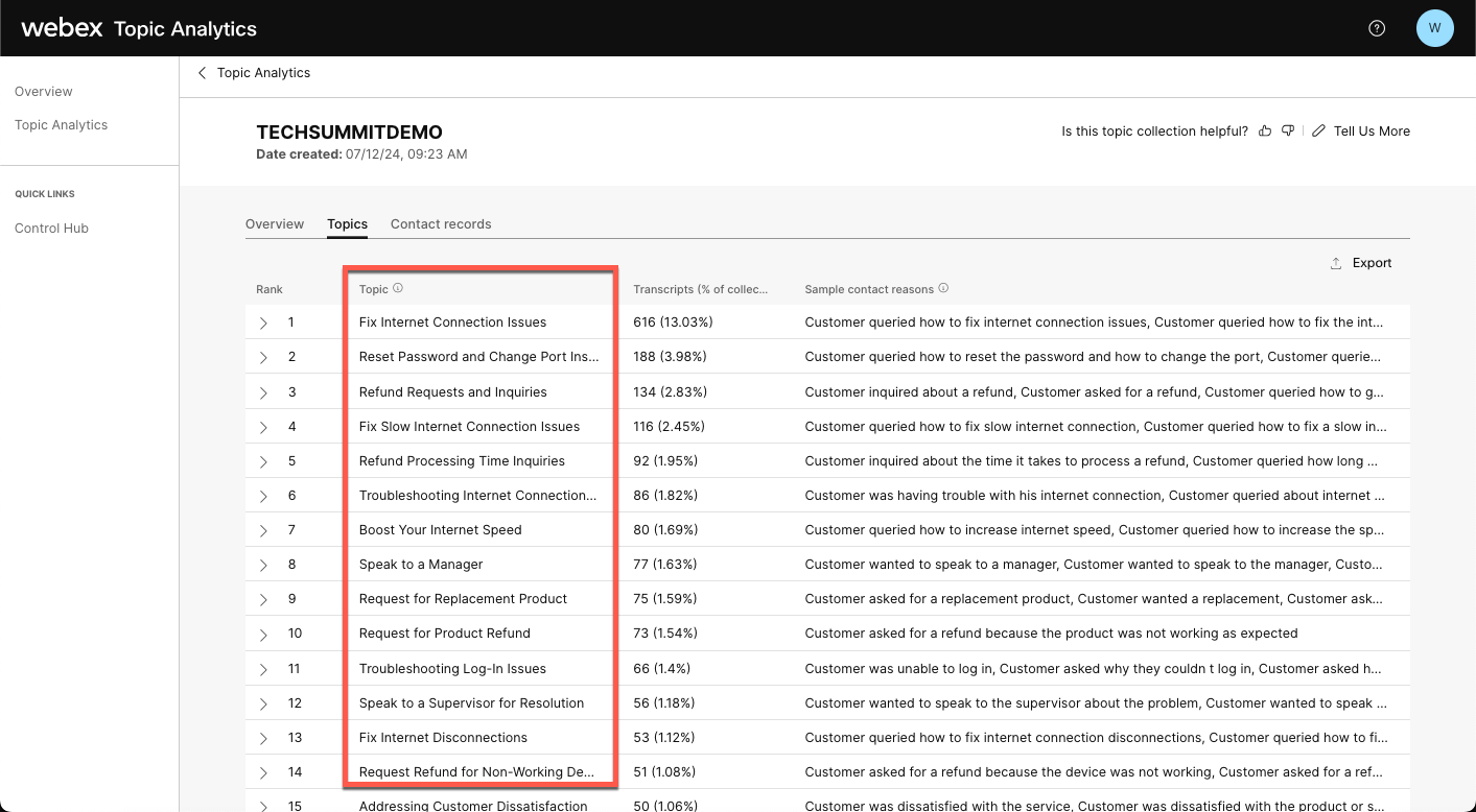 The objective of this lab is to gain a comprehensive understanding of Topic Analytics in Webex Contact Center to help identify potential candidates for automation, and apply the insights gained to enable subsequent AI-powered automation processes. This involves exploring various Topics identified by the AI model, analyzing individual conversations to identify areas of Automation. In this lab you are tasked to identify the top two opportunities for automation and capture the essential information needed to create the automation workflow by reviewing the customer conversations.