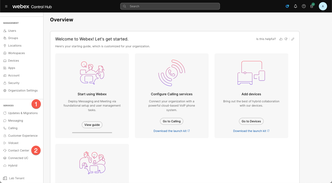Login to the Webex Control Hub using the admin credentials provided. ( Launch https://admin.webex.com/ )