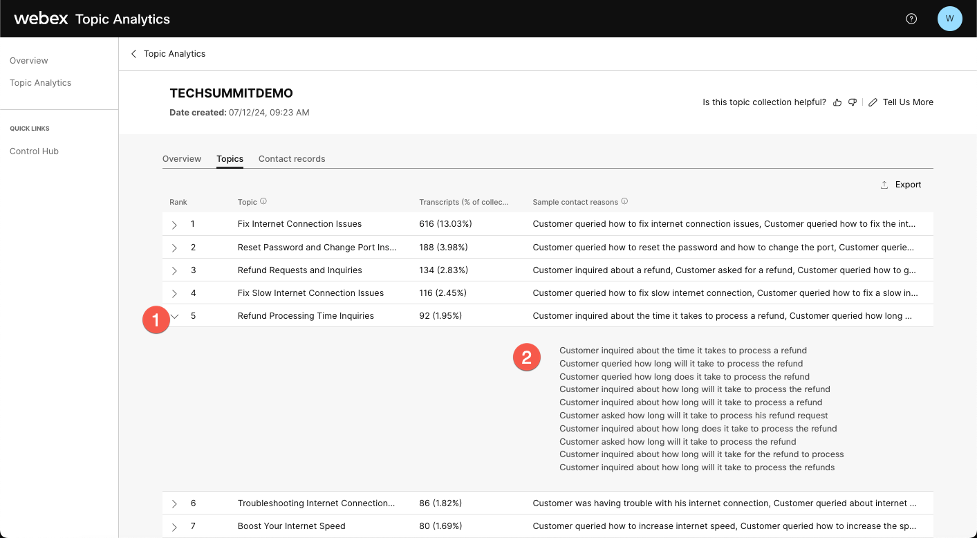 Additionally, you can click on the Expand button (>) to view all the call drivers associated with the Topic.