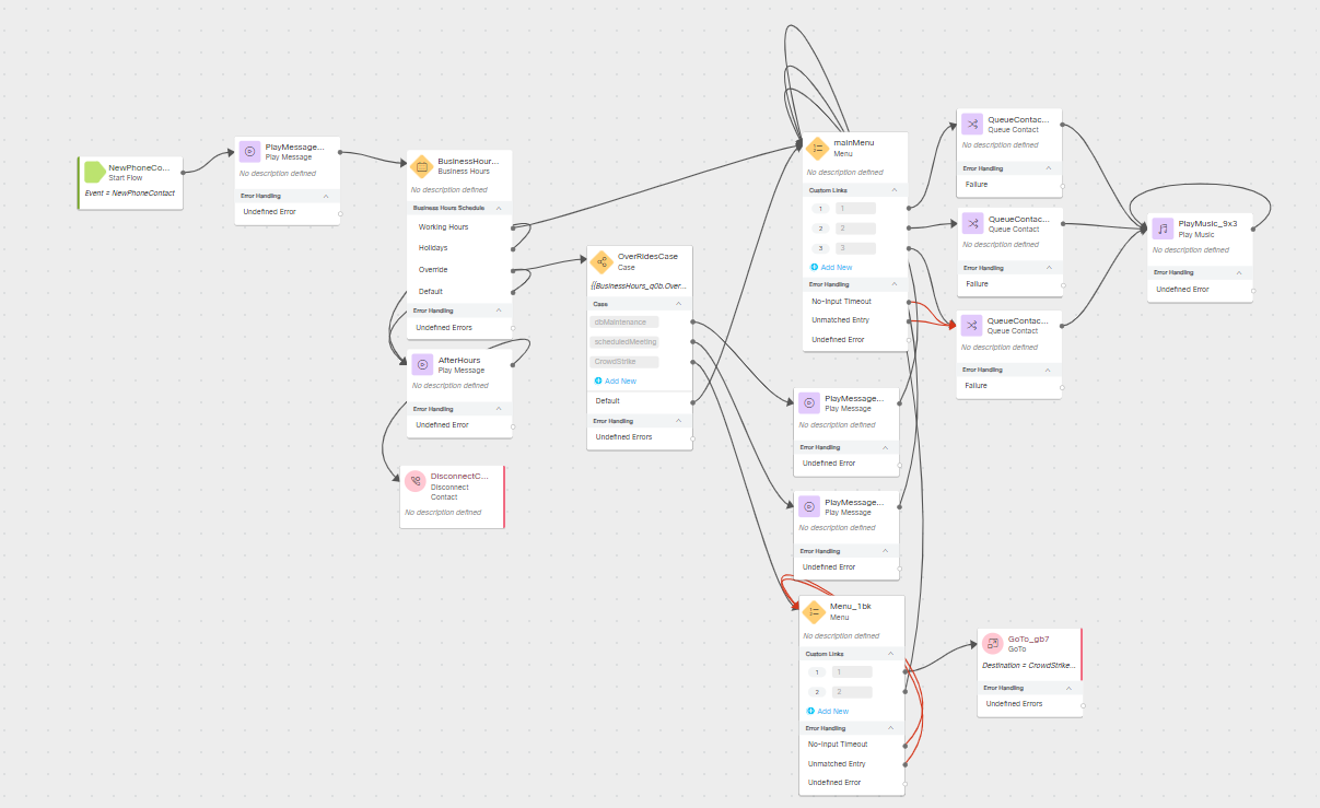 - After unit testing the new flow, edit the main flow changing the Play Message option into a Menu and a go to flow node