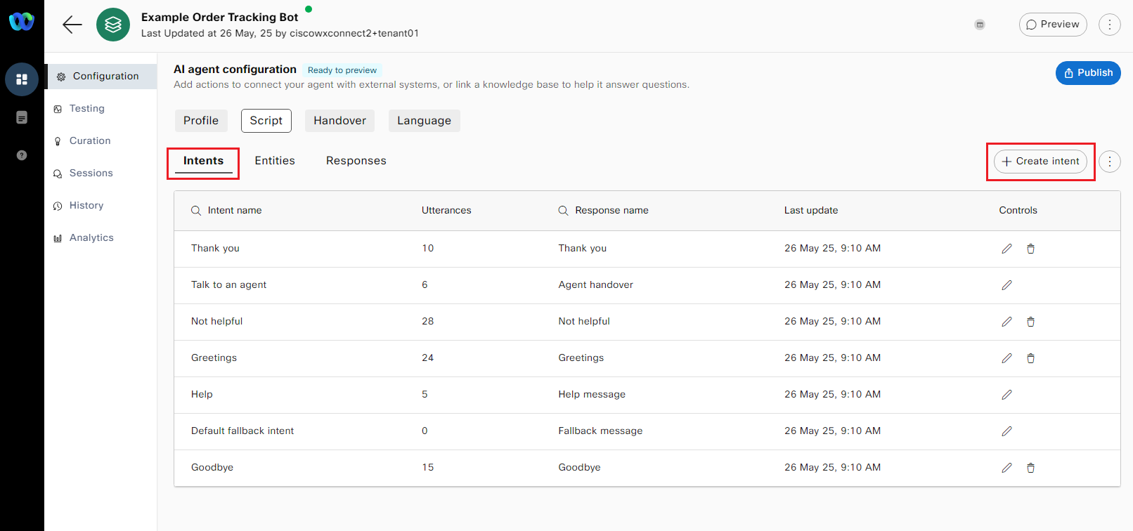 a. In the AI Agent configuration, navigate to Script -> Intents -> click on the Create intent button.