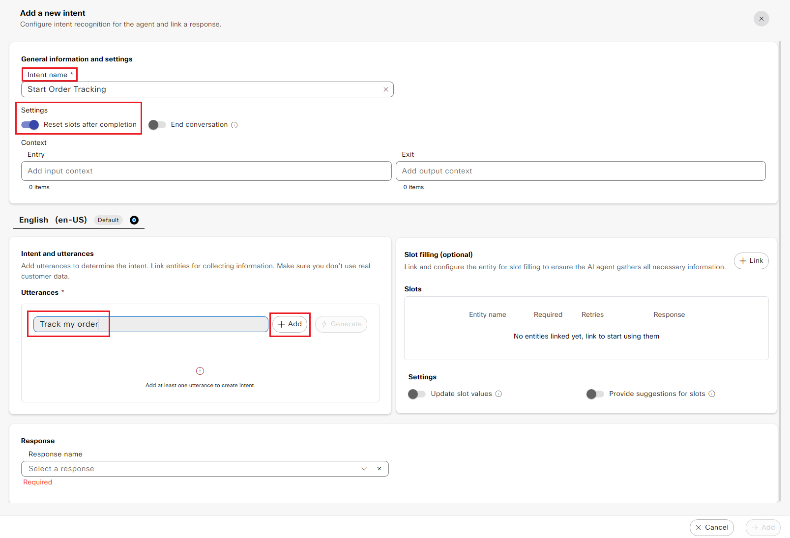 b. Enter the Intent name as "Start Order Tracking" and enable the toggle button to Reset slots after completion.