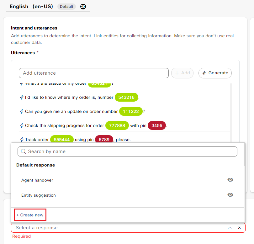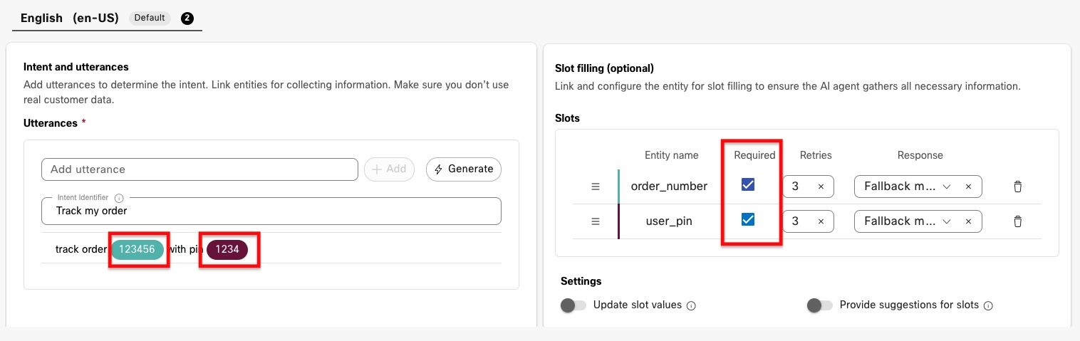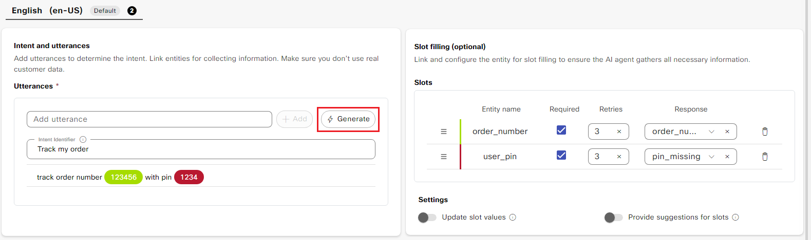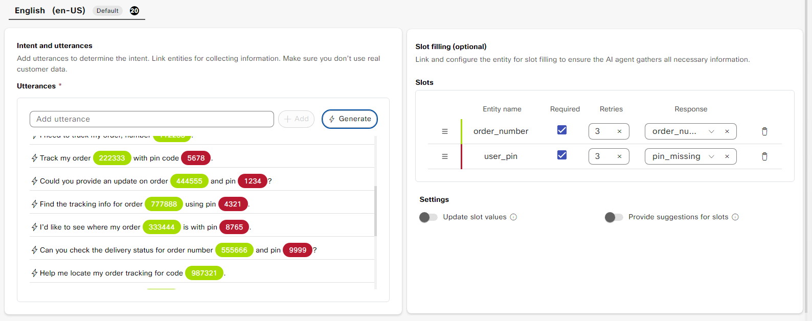 - As soon as the 2nd utterance is added, the 6 digit number and the 4 digit pin will be highlighted and previously created entities of "order_number" and "user_pin" are added under the Slot filling section.