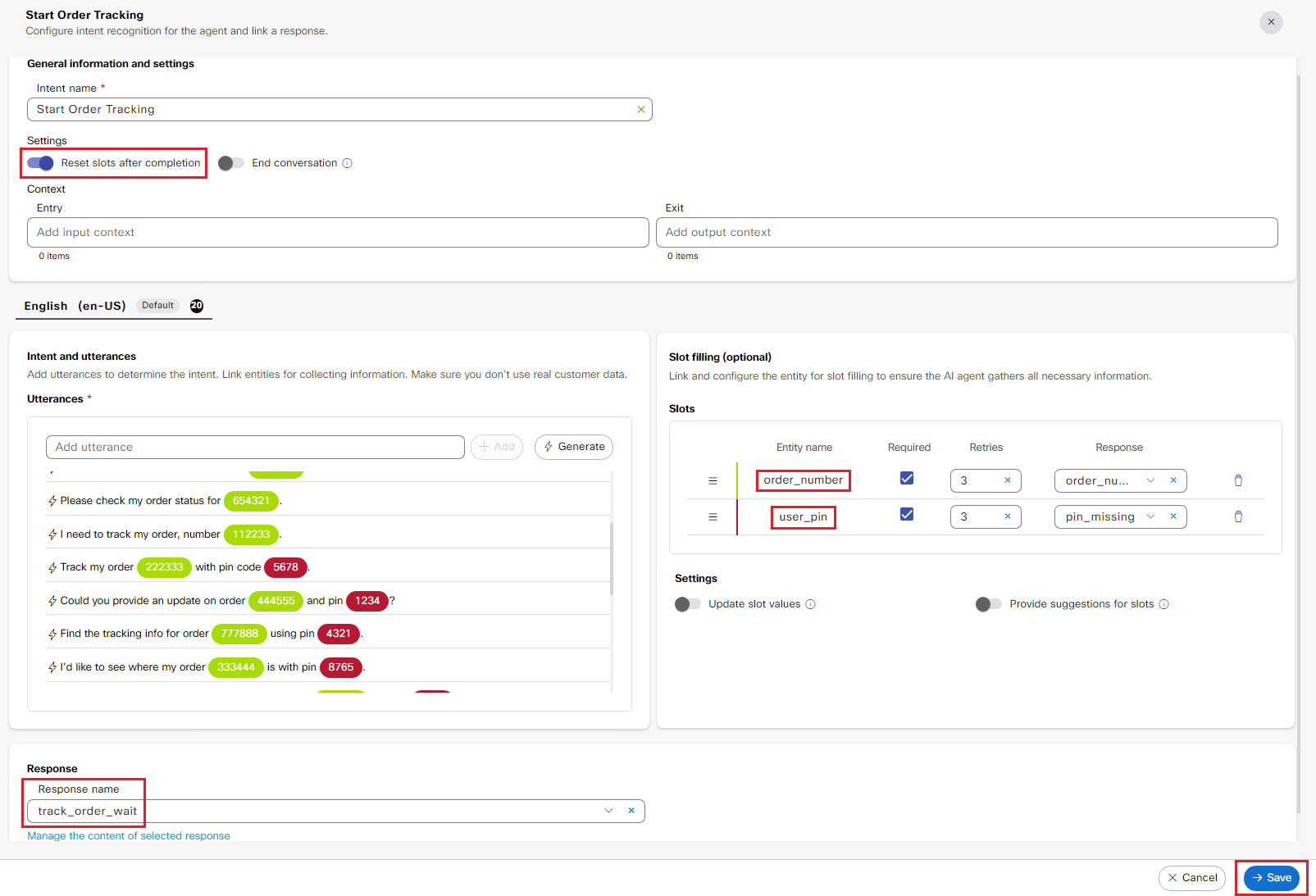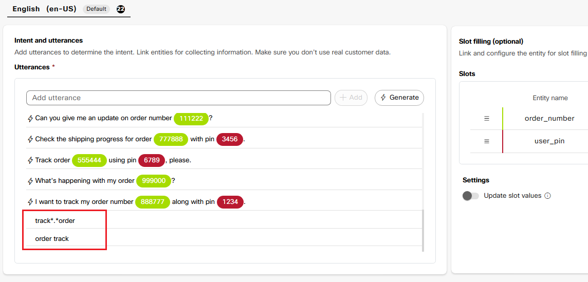 i. This is what your Intent and utterances configuration section should now look like. The order_number and user_pin slots should now be highlighted automatically. You can add more utterances if you like.