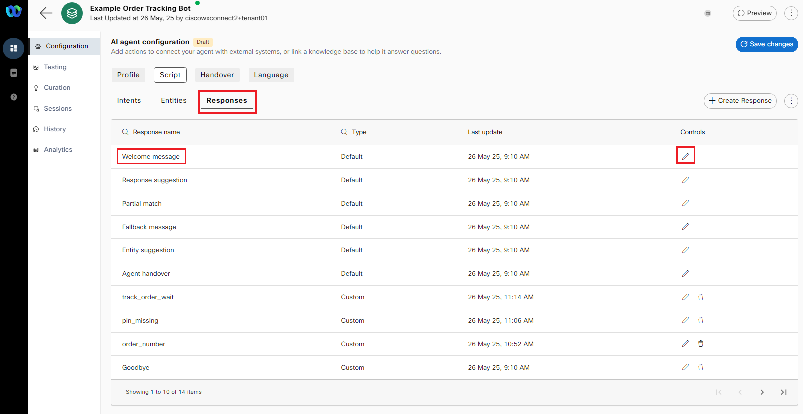 a. In the AI Agent configuration, navigate to Script -> Responses -> click on the Welcome message response.