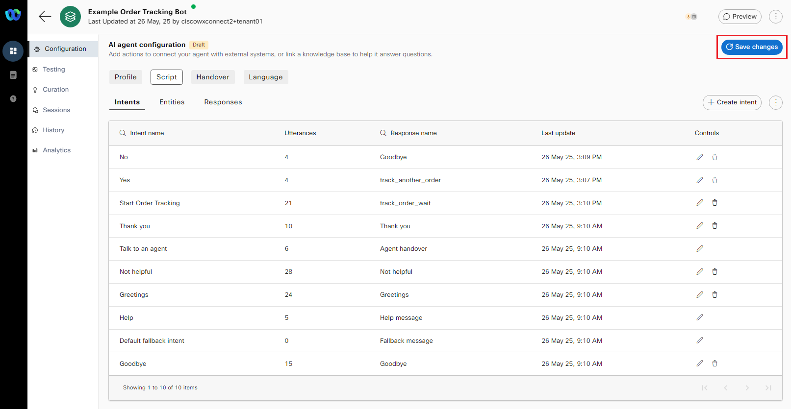 a. On the top right of the AI agent configuration dashboard, click on Save changes.