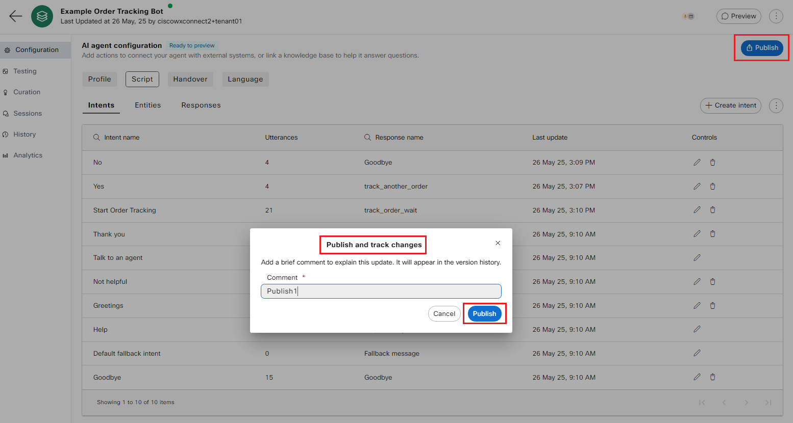 b. Next, click on the Publish button which then loads a prompt to enter a comment to track the saves/changes made to the AI Agent.