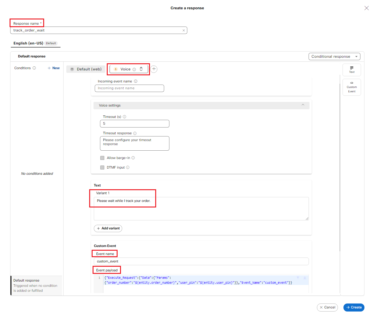 b. In the Create a response pop up windows, enter the response name as track_order_wait and then select the + symbol and click on Voice to add Voice channel.