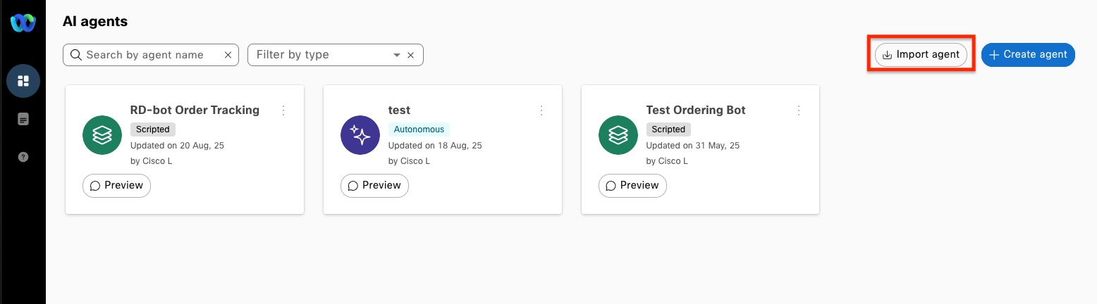 b. In AI Agent Studio, select the Import agent button at the top, right side of the studio.