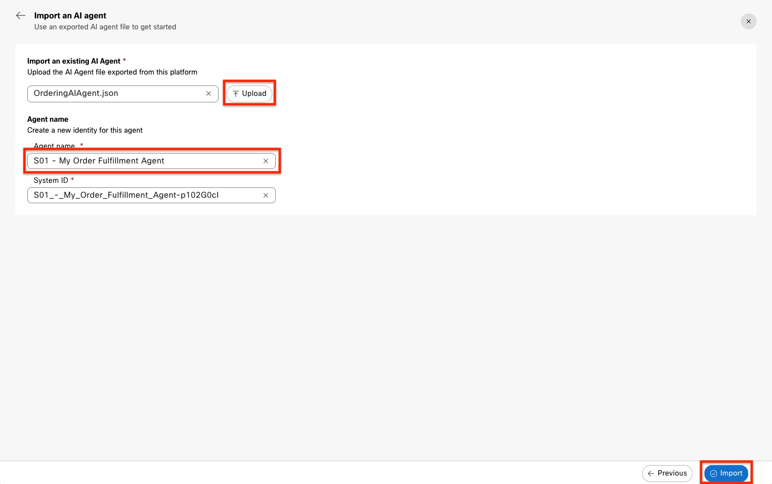 c. Select the Upload button, then navigate to where you extracted the Agent and select it to import. Provide unique agent name. To do this, include your seat number in the format of, "S01 - My Order Fulfillment Agent". The System ID will be automatically generated, accept the default. After validating that everything is correct, select the Import button at the bottom, right of the page.