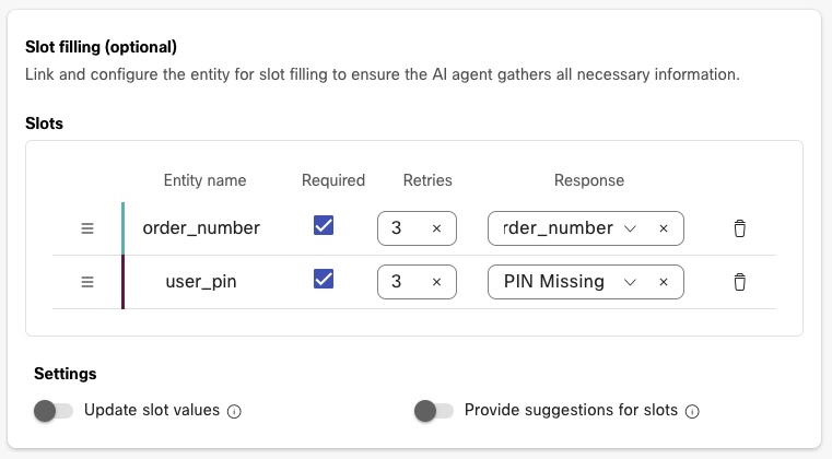 As part of the Intent, the agent needs to collect the basic info like order number and the user pin so that these 2 values can be passed to the API to look for the status of an order in the database.