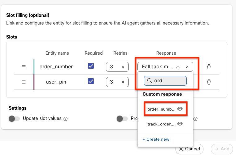 e. Add the Response for missing order number by selecting the drop-down next to the order_number entity in the Slot filling section. In the search box, begin typing the phrase "order_number" and select the Custom response named, "order_number".