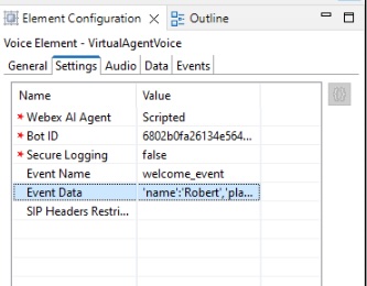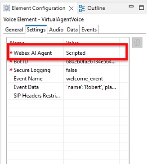 a. Select the TrackerBotStart VAV element, then select the Settings tab. The Webex AI Agent setting allows you to select which type of VAV agent you will be working with. Notice that we have selected the value, Scripted in the dropdown.