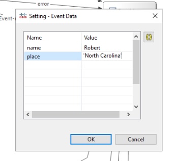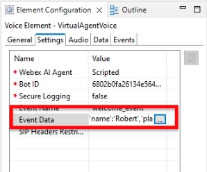 Step 7. The Event_Data setting in the VAV element allows us to pass data to the agent. In the first VAV element, we will pass in two static values. In the TrackerBotStart Settings, locate the Event Data and click on the ellipsis (three dots) in the Value.