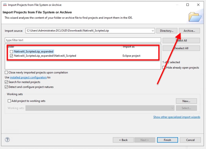 In the Import Projects from Folder or Archive dialog box, select the Archive button at the top of the box, then navigate to where you downloaded the example application and select it. Once you are back at the import dialog, ensure that you uncheck the folder "NativeAI_Scripted.zip_expanded" and leave the "NativeAI_Scripted.zip_expanded\NativeAI_Scripted" selected. Refer to the image and once all options are set, select Finish.