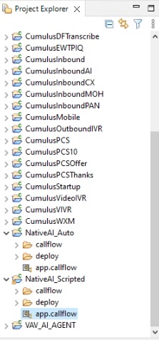 Step 4. In the Project Explorer, locate the NativeAI_Scripted project. Expand this and double-click on the app.callflow to open the example application.