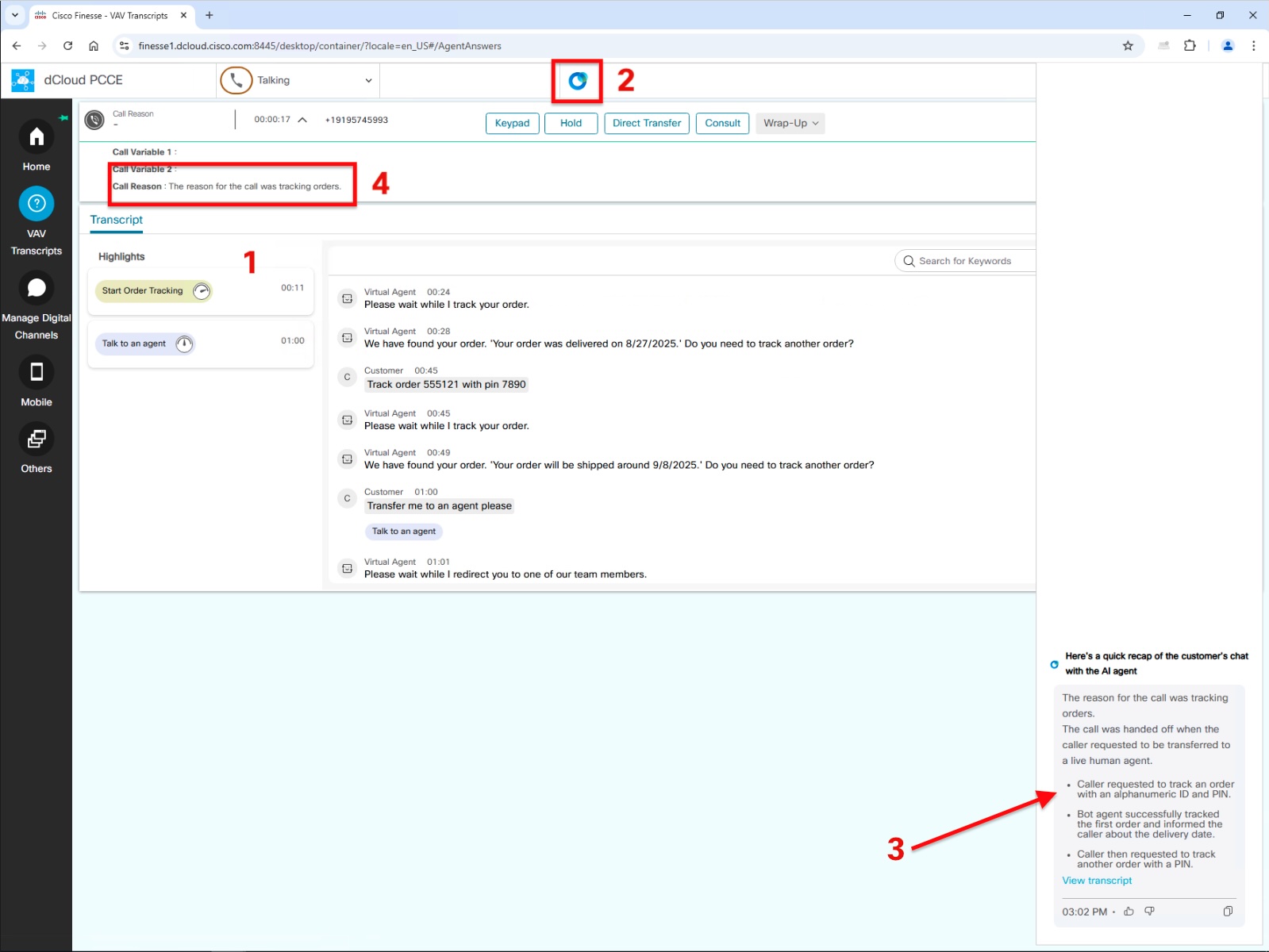 When you are done testing the AI Agent, ask to speak to a human agent. You should then see the call arrive at the Finesse desktop. Answer the call and notice that the transcript shows up. Notice in this version of the transcript, you can see the intents that the customer encountered in their conversation. Select the AI Assistant button (2) at the top to show the AI Assistant. Here (3), you will see a summary of the call. Finally, notice the call variable "Call Reason" (4) which gives a one sentence summary of what the customer called about.