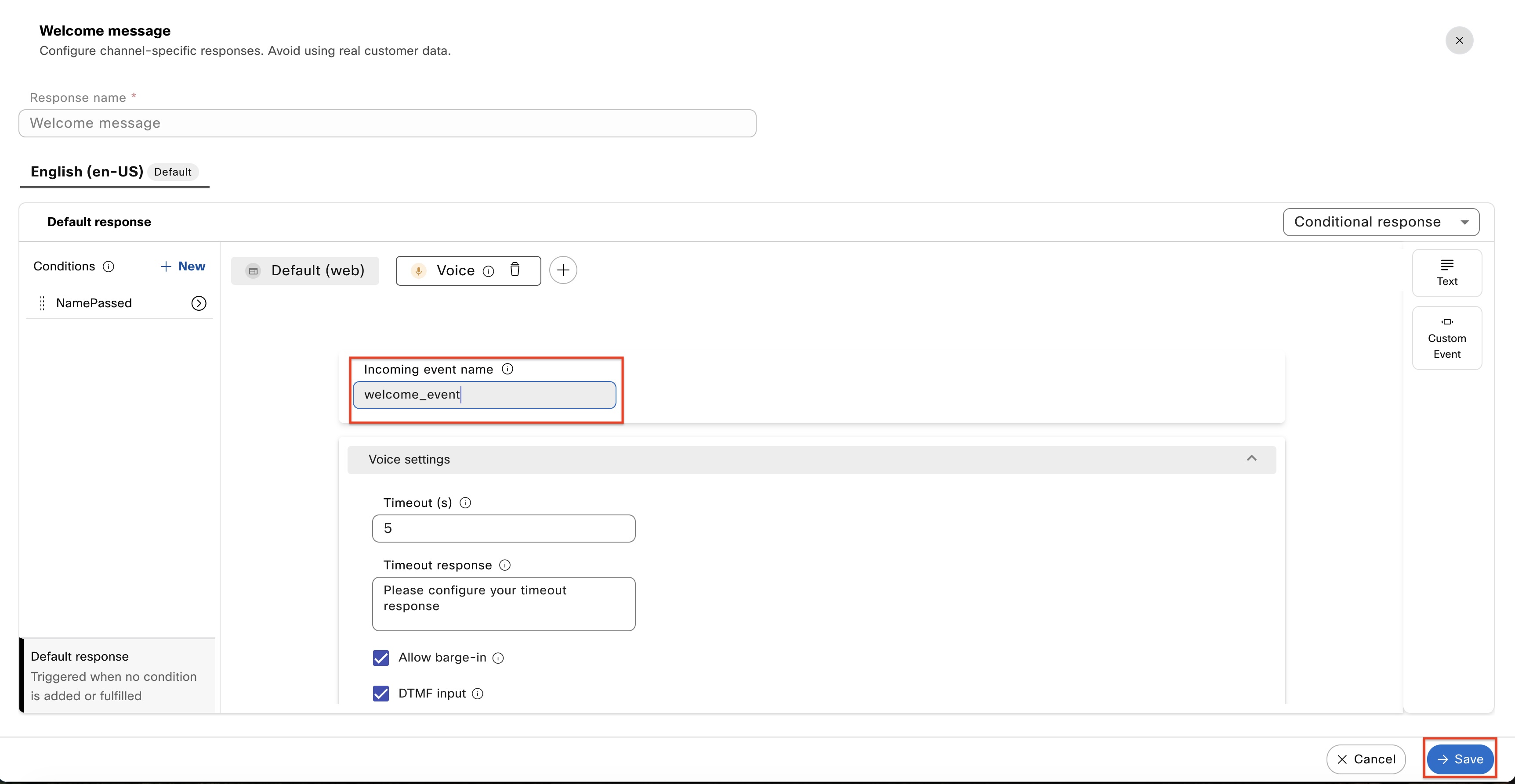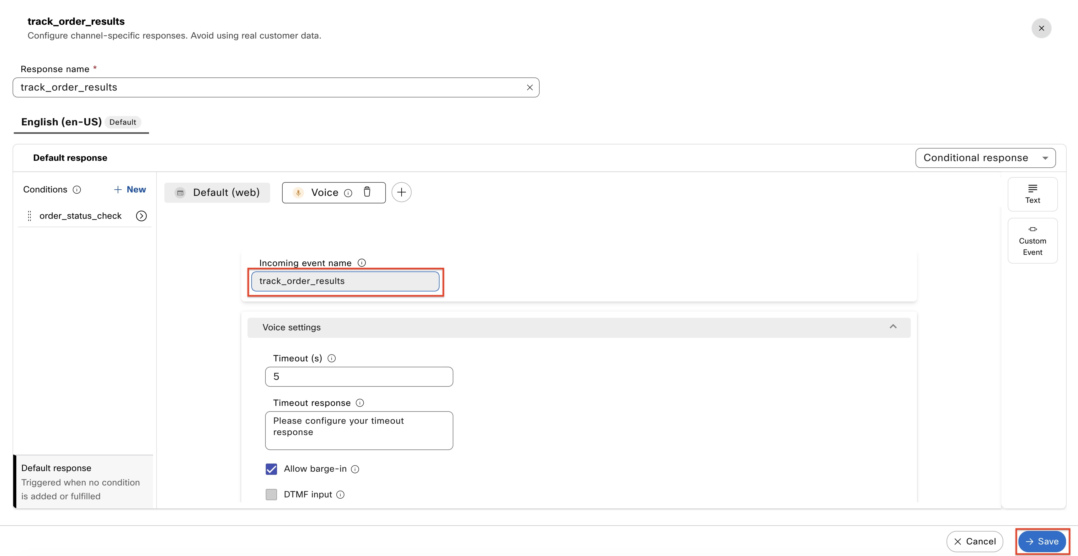 b. Next, select the Voice channel response located next to Default (web).