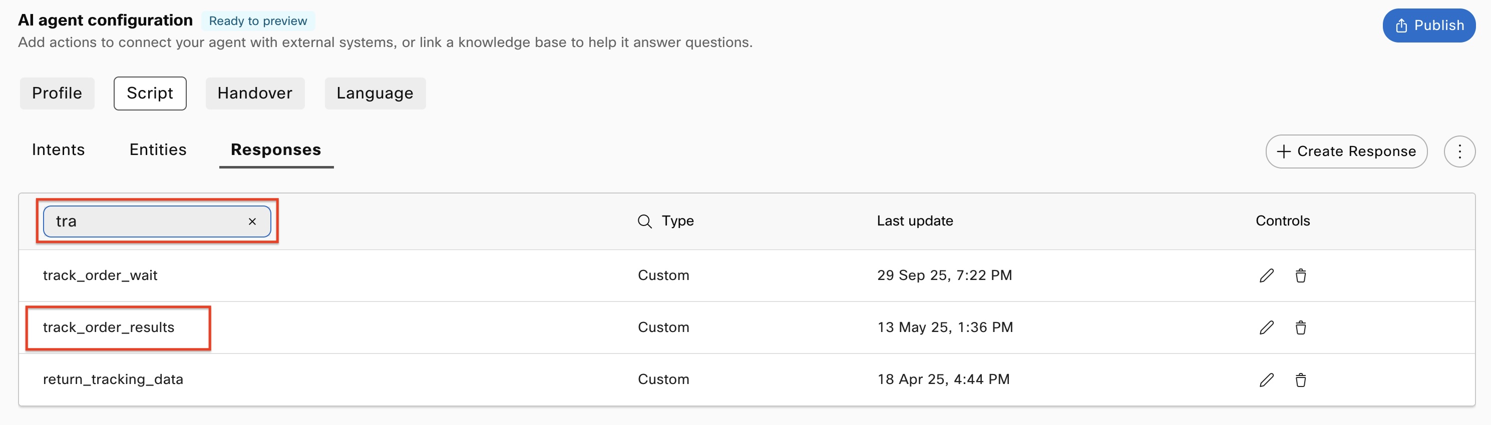 d. In the AI Agent configuration, navigate to Script -> Responses -> Click on the magnifying glass next to "Response Name" to search for a response. Type in the first few letters of, "track_order_results". Locate the Response in the list, and select it to edit it.
