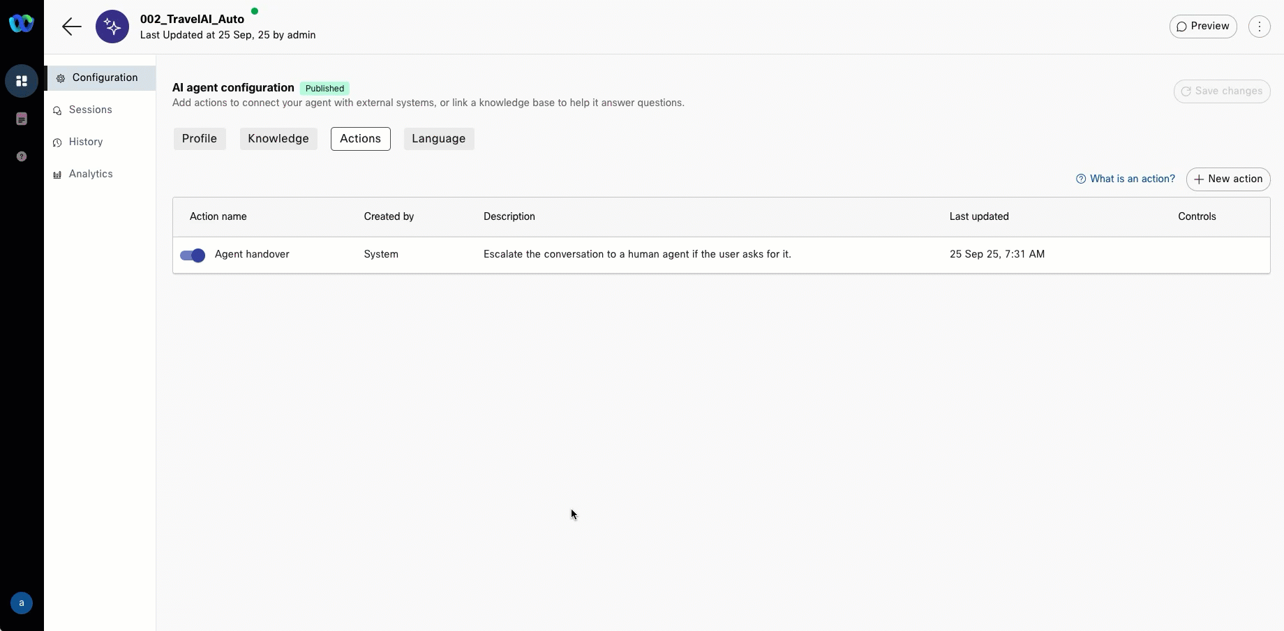 - Go to Actions tab → turn ON Agent handover.