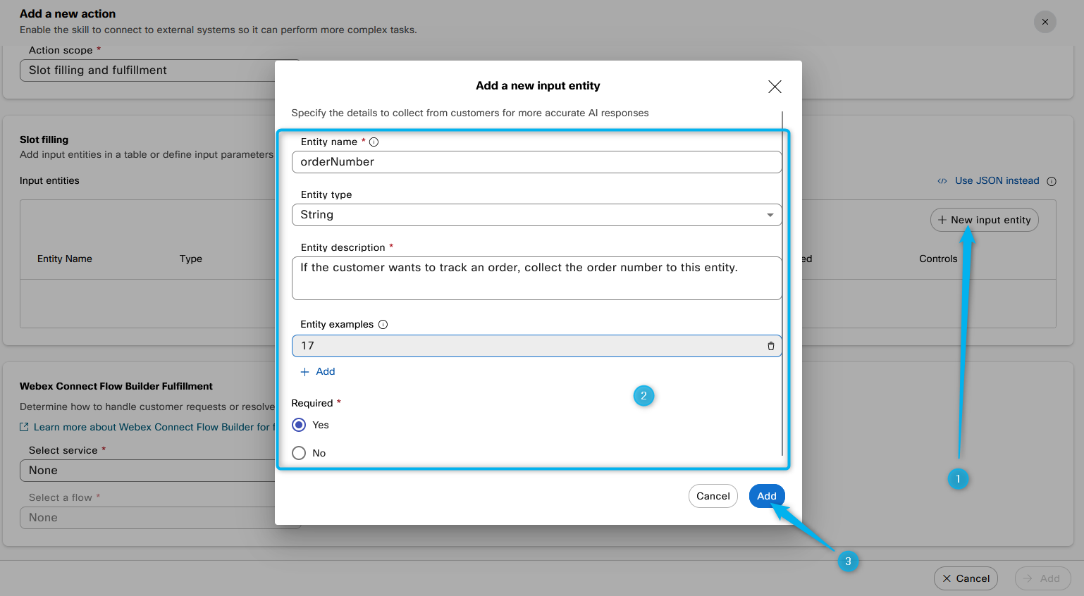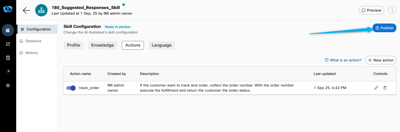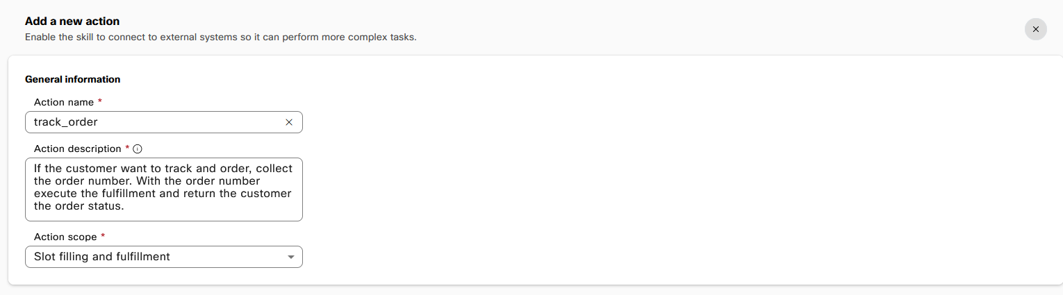 In the Action description provide the following:If the customer want to track and order, collect the order number. With the order number execute the fulfillment and return the customer the order status. .