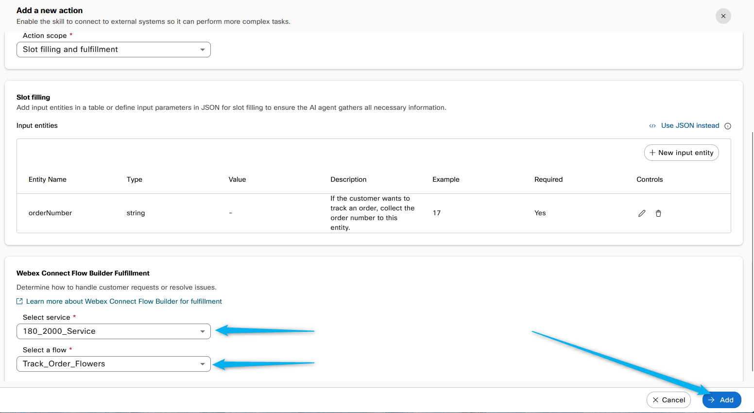 Configure the fulfillment flow to track the status of existing orders. This functionality will allow the system to track the status of an order after the customer provides the order number, so the agent does not have to do any manual work and can simply deliver the order status to the customer.