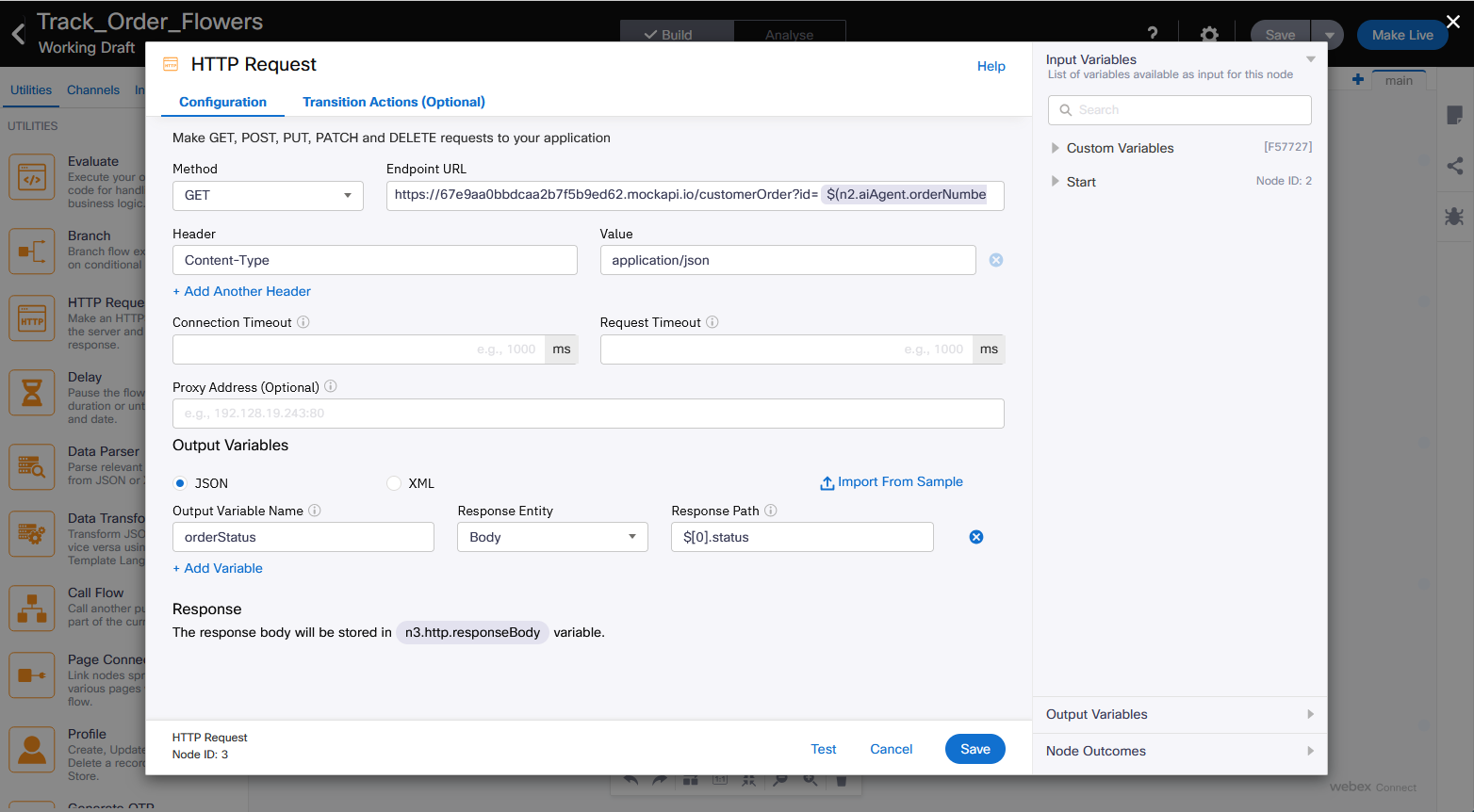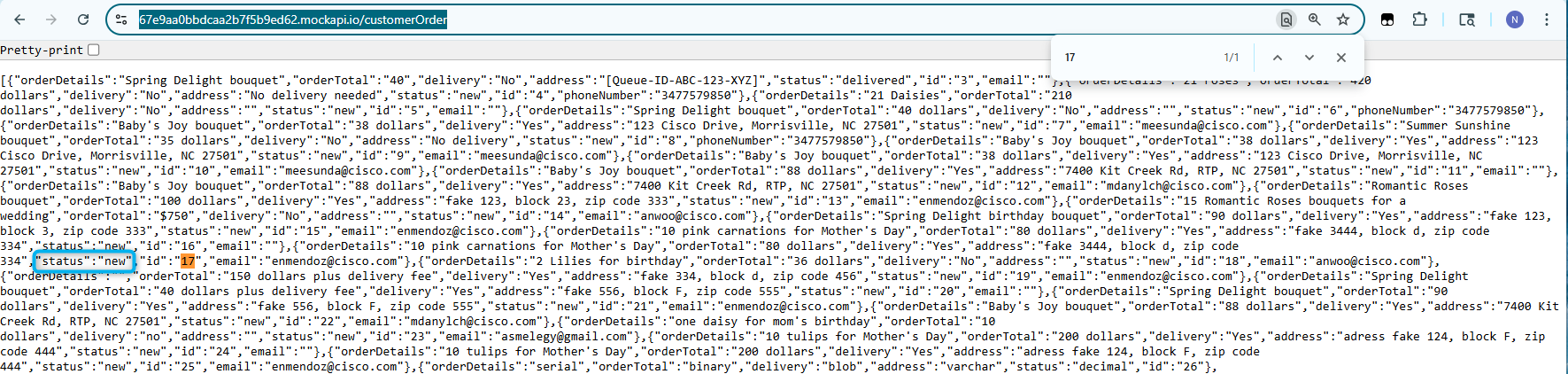 Endpoint URL:https://67e9aa0bbdcaa2b7f5b9ed62.mockapi.io/customerOrder?id=$(n2.aiAgent.orderNumber)