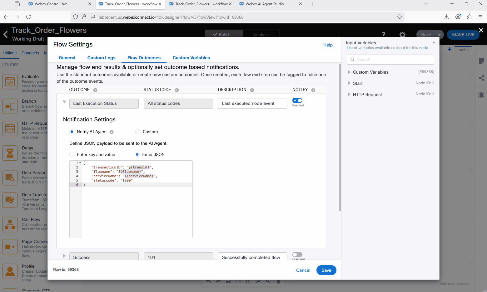 While on your Webex Connect flow, click on Edit the flow then click on the Settings and on the top select Flow Outcomes and expand Last Execution Status. In the Define key-value pairs to be sent to the AI Agent select Enter JSON.