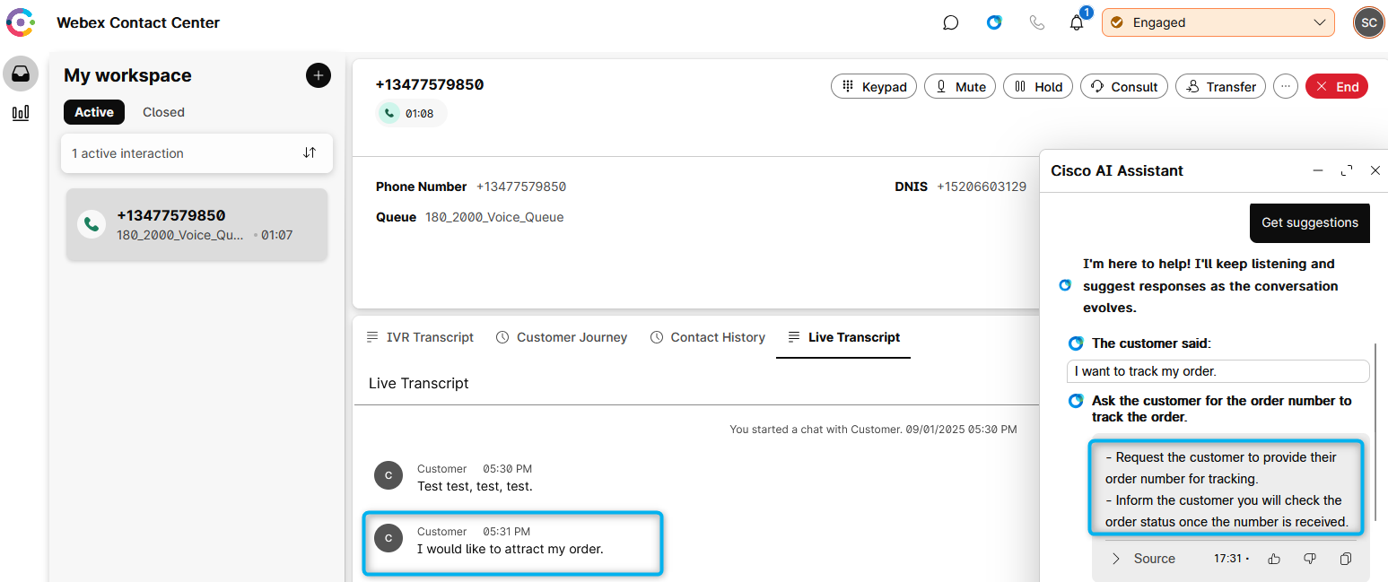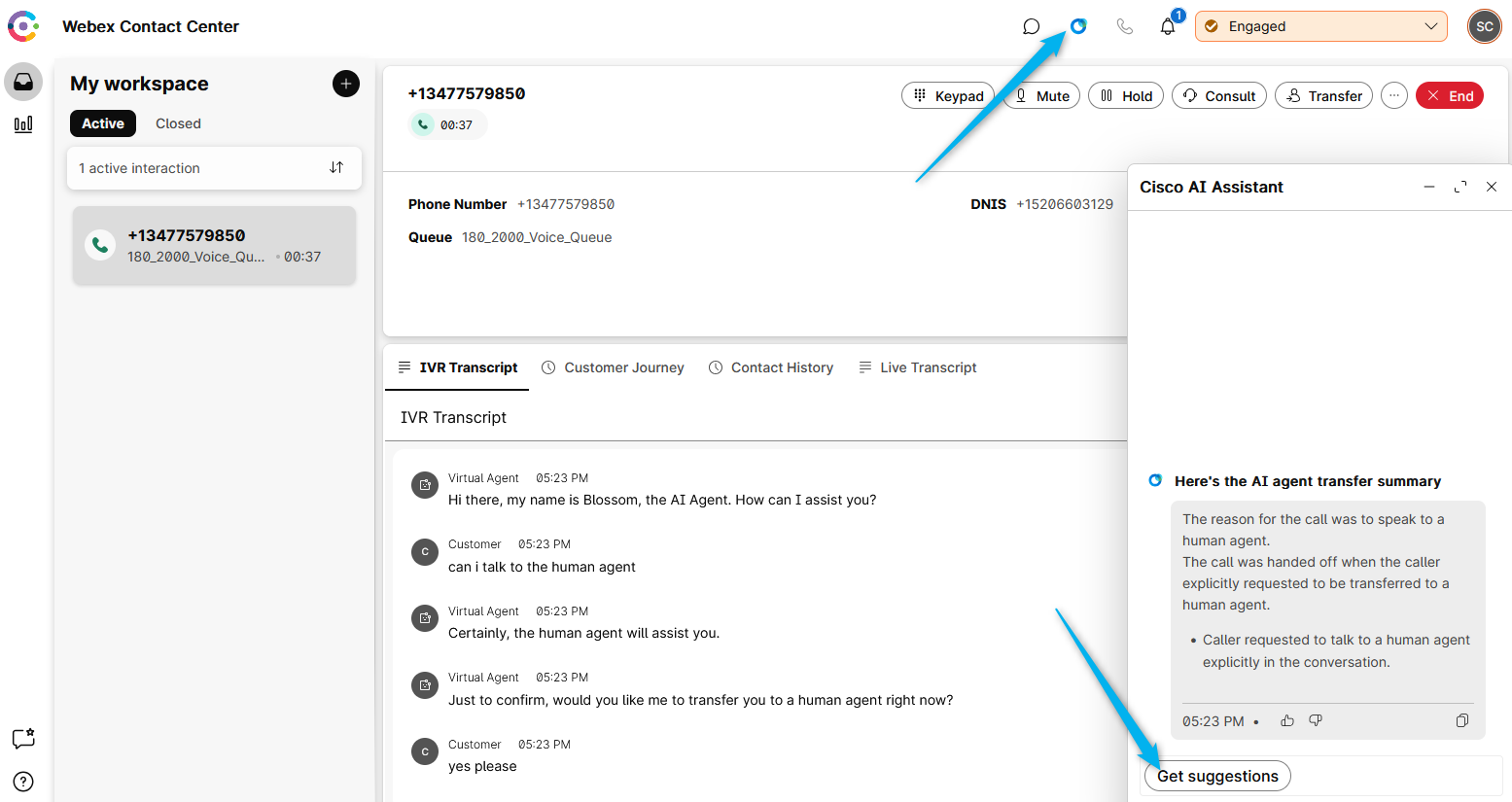 Once the call is connected to the Agent Desktop, select the AI widget and then click on Get suggestions.