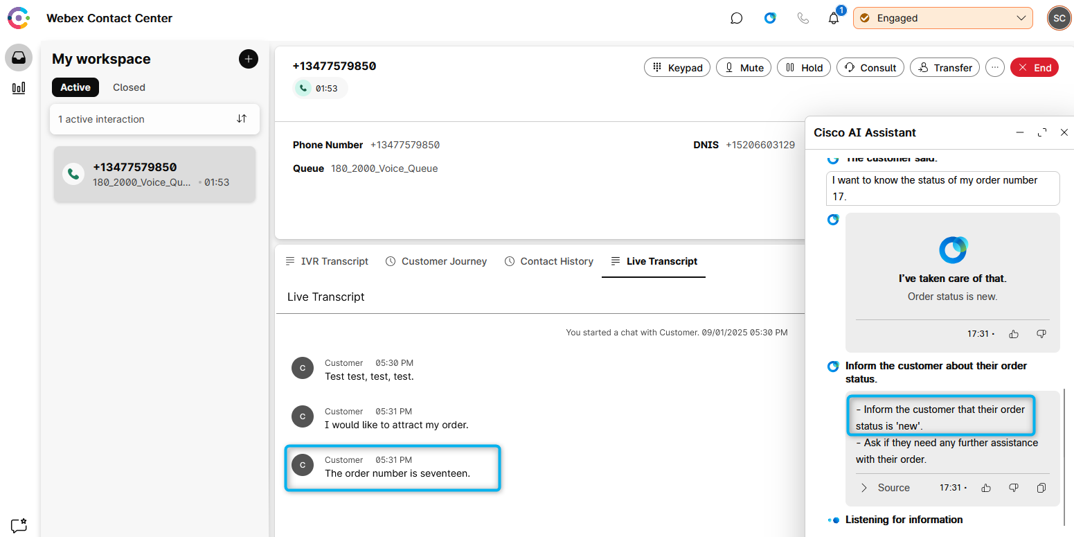 As the caller, provide your order number, and you should see the AI execute the fulfillment to place an API call to the third-party application to retrieve the response. For this lab, all order statuses are "new," so you should see that the AI responds that the order status is "new."