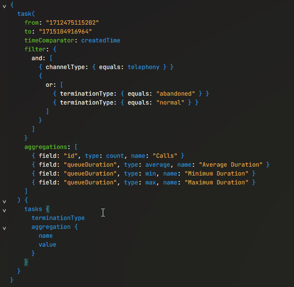 - Comment out the filter for termination type of abandoned, the aggregation for Minimum Queue Duration, and termination type in the fields list (